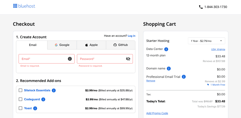 I want to reiterate why you should purchase at least a 12 month hosting plan. Month-to-month is less effective, and I highly recommend signing up for a minimum of 12 months for many reasons. By signing up for a minimum of 12 months, you will receive a free domain name, lower pricing, and you won’t have to deal with an expired website after each month. For example, if hosting is not renewed or if the card expires, then your website is down and you risk losing business (visitors/traffic) when you pay on a month-to-month basis. It’s also exceptionally more expensive to pay month-by-month rather than in one lump sum. The more years you sign up for, the less you pay.