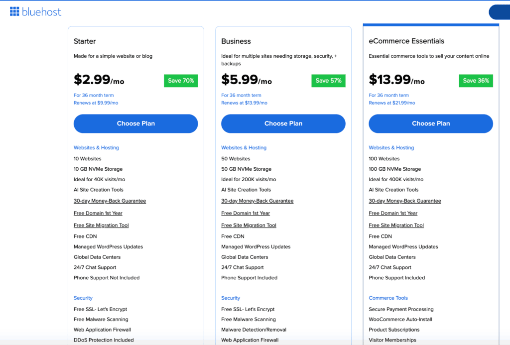 • To receive the cheapest price to start a blog, then choosing the “Starter” or “Basic” plan is really all you need. It’s only $2.99 per month through my link (due upfront in full) if you sign up for 36 months (the pricing is always changing, so you may see something slightly different), which is a great price. If you are unsure about blogging, I would sign up for the 12 month plan as this is a great price and very affordable for one year of blogging. If you purchase a 12 month plan, your total price is around $50 a year, which is a great price. Plus, you still receive the free domain name when you sign up for 12 months or more which saves you money.