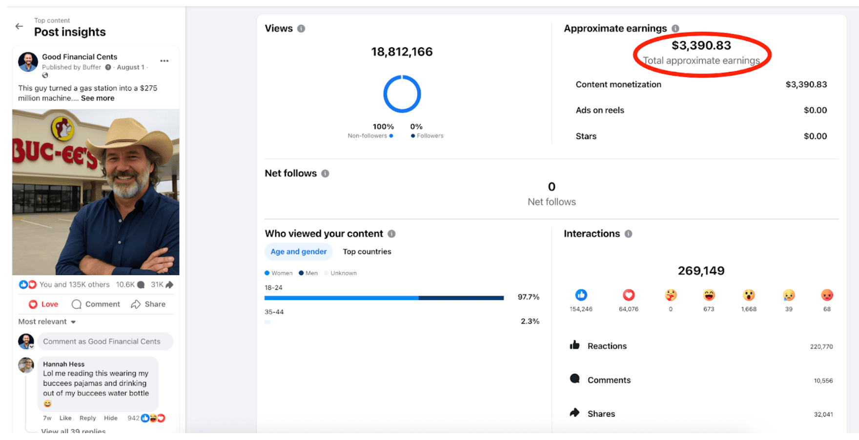 The first one was about Buc-ee’s, the gas station. And listen, I’m obsessed. I can’t drive by a Buc-ee’s without stopping. Their brisket sandwiches and roasted almonds are unreal. So when I shared a post about the origin story of Buc-ee’s, I had a pretty good feeling it would hit. And it did. That single post reached over 18 million people, pulled in more than 269,000 interactions, and earned me $3,390.